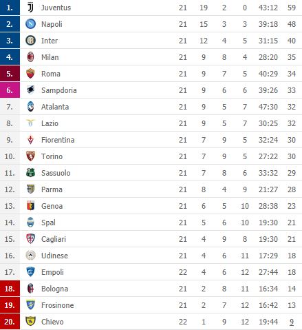 Il Napoli allunga sull'Inter e accorcia sulla Juventus grazie ai tre punti contro la Sampdoria, in attesa delle sfide della prima e della terza in classifica. Il Napoli è ora a -8 dalla Juventus e a +11 dall'Inter. I bianconeri giocheranno alle 20.30 contro il Parma. L'Inter è impegnata domani contro il Bologna.