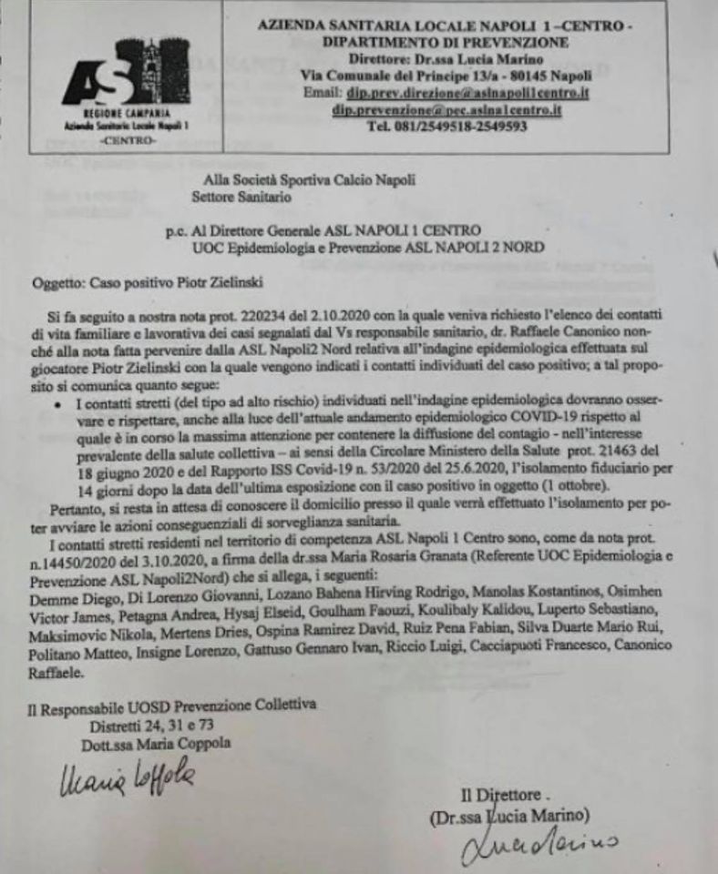 FOTO - ASL, ecco il documento: azzurri obbligati all’isolamento nei propri domicili