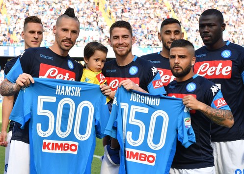 Momenti di grande emozione al San Paolo durante il riscaldamento: gli azzurri hanno dedicato una maglia speciale per Marek Hamsik, che ha raggiunto le 500 presenze in azzurro, Jorginho, che ha superato le 150, e per Christian Maggio, alla sua ultima con la maglia del Napoli. Il terzino ha salutato la Curva B con il suo tipico inchino, ricevendo uno striscione a lui dedicato, "sei l'esempio".
