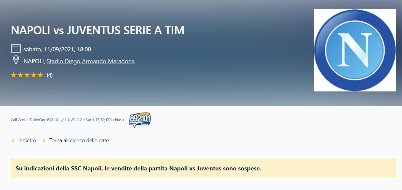 Sarebbe dovuta partire stamattina alle 12 in prelazione per i possessori voucher - cioè i vecchi abbonati pre-covid - la vendita dei biglietti per la sfida contro la Juventus del prossimo 11 settembre allo stadio Maradona. Invece sul sito si legge che il Napoli ha al momento sospeso la vendita dei tagliandi scatenando la rabbia dei tifosi che erano già da tempo in coda virtuale per acquistarli. Ecco la foto del sito Listicket: