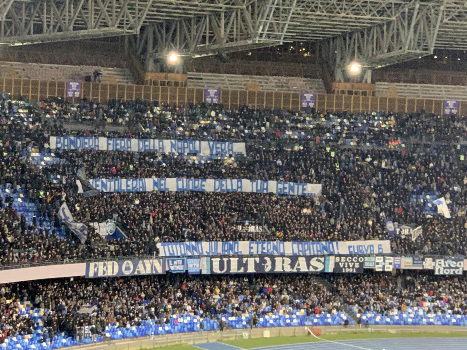 La Curva B ha esposto un enorme striscione per ricordare o omaggiare Antonio Juliano, ex storico capitano e dirigente scomparso in settimana all'età di 80 anni. Questo il testo dello striscione: "Bandiera fiera della Napoli vera... sventolerai nel cuore della tua gente... Totonno Juliano, eterno capitano!"