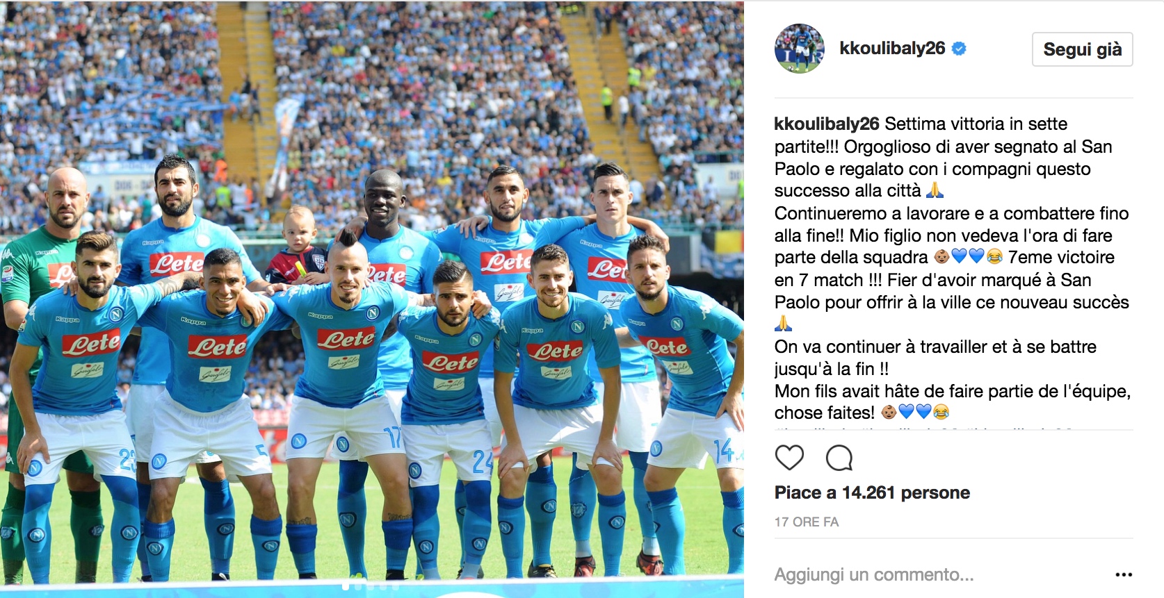 Grande gioia per Kalidou Koulibaly, a segno nel 3-0 del Napoli sul Cagliari. Così il difensore su Instagram: "Settima vittoria in sette partite!!! Orgoglioso di aver segnato al San Paolo e regalato con i compagni questo successo alla città. Continueremo a lavorare e a combattere fino alla fine!! Mio figlio (nella foto di gruppo in braccio al papà, ndr) non vedeva l'ora di fare parte della squadra".