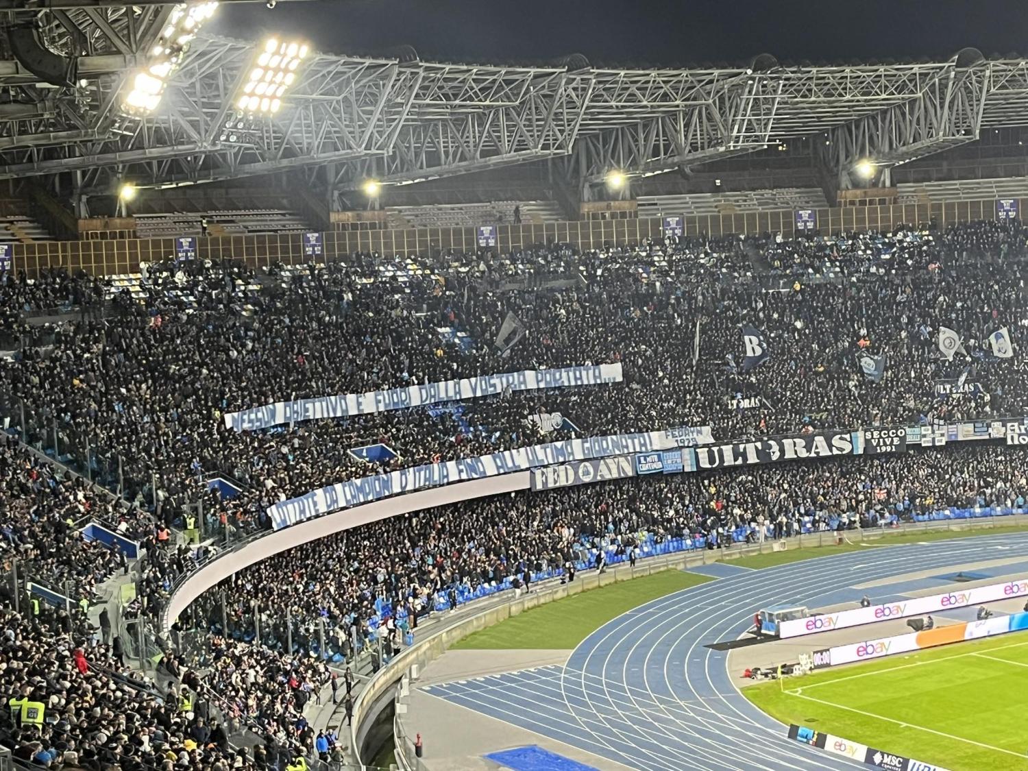 Striscione d'incitamento da parte della Curva B alla squadra esposto al Maradona prima del fischio di inizio di Napoli-Inter. "Nessun obiettivo è fuori dalla vostra portata. Lottate da campioni d’Italia fino all’ultima giornata”, questo il testo firmato dal gruppo Fedayn. Di seguito lo scatto dal Maradona.