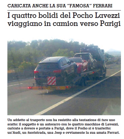 Un addetto al trasporto non ha resistito alla tentazione di fare uno scatto: il soggetto è un autocarro con le quattro macchine di Lavezzi, caricate a dovere e portate a Parigi, dove il Pocho si è trasferito: un’Audi, un fuoristrada, una Jeep e ovviamente la sua amata Ferrari.