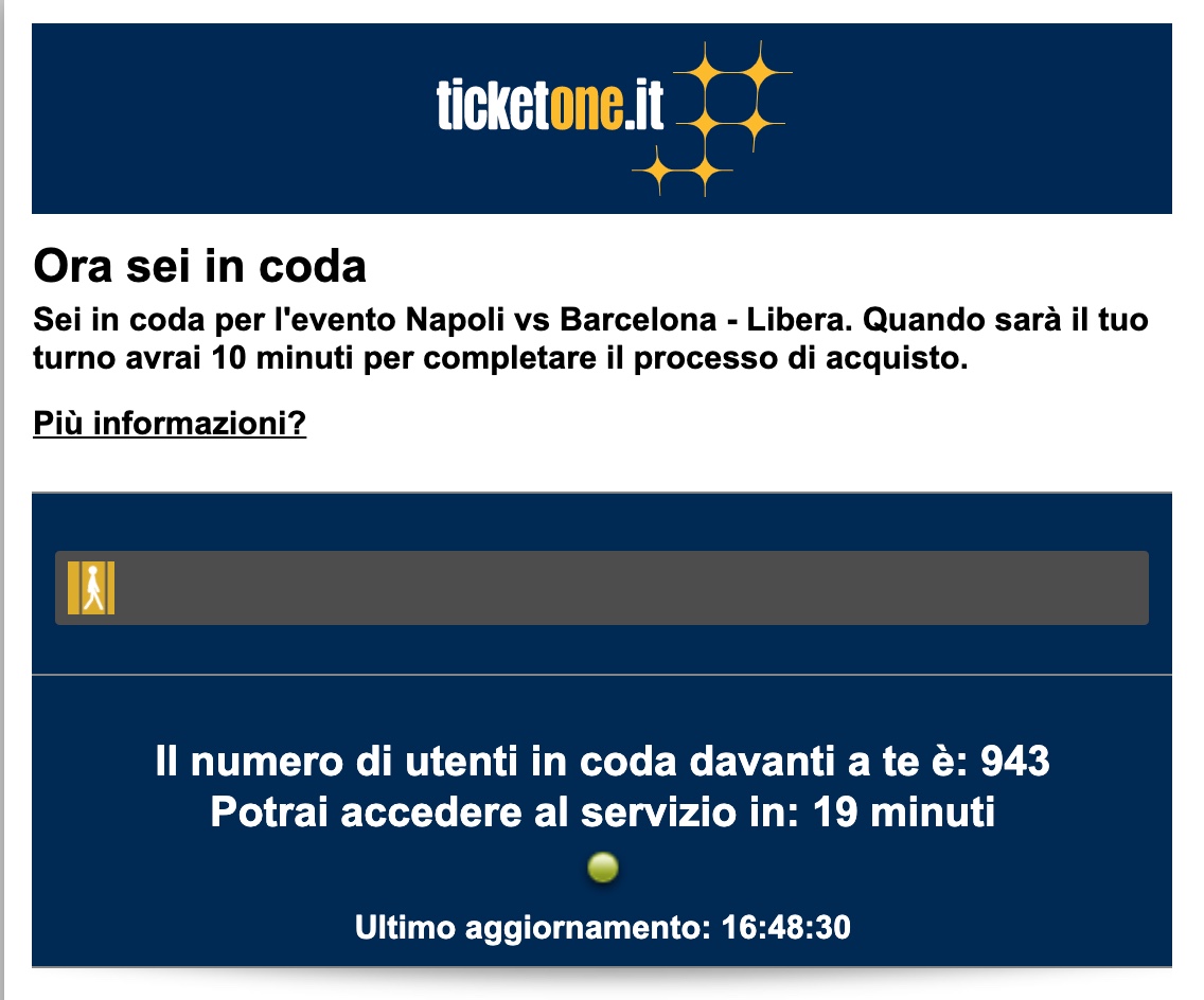 Alle 16 è ripresa (per il momento solo on line) la vendita dei biglietti per Napoli-Barcellona, come comunicato dal club partenopeo, e la piattaforma di Ticketone è stata subito presa d'assalto. Al momento infatti il sistema propone una fila virtuale (nella foto allegata) con quasi un migliaio di tifosi in fila per potersi assicurare un biglietto.
