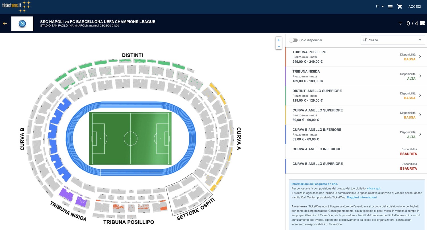 Partita alla grandissima la vendita dei biglietti per Napoli-Barcellona, in programma il 25 febbraio al San Paolo. Dal sito ticket.one è possibile apprendere lo stato della vendita, avviata questa mattina, che è partita subito a gonfie vele. La Curva B superiore risulta già sold out per la sfida ai blaugrana ma in questi minuti tutti i settori sono in eusarimento.