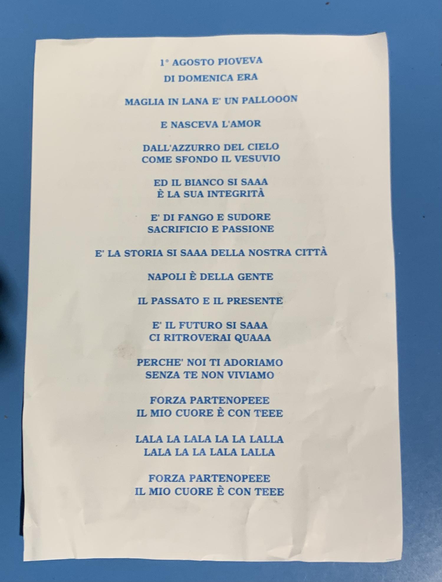 “La tua voce per sempre tra le nostre mura” era uno striscione esposto mercoledì dai tifosi del Napoli a Reggio Emilia per ricordare la scomparsa di Cristian Vollaro, tifosissimo del Napoli, musicista e compositore, scomparso all'età di 45 anni. Ma l’omaggio di mercoledì avrà un seguito. In occasione della gara contro la Juventus di domenica infatti le due curve canteranno un inno scritto proprio da lui. L'inno si sentirà anche dagli altoparlanti dello stadio. Il testo è stato diffuso affinché tutti possano impararlo per domenica per ricordare il tifoso scomparso. Di seguito il volantino della Curva A e B distribuito ai tifosi all'esterno dello stadio.