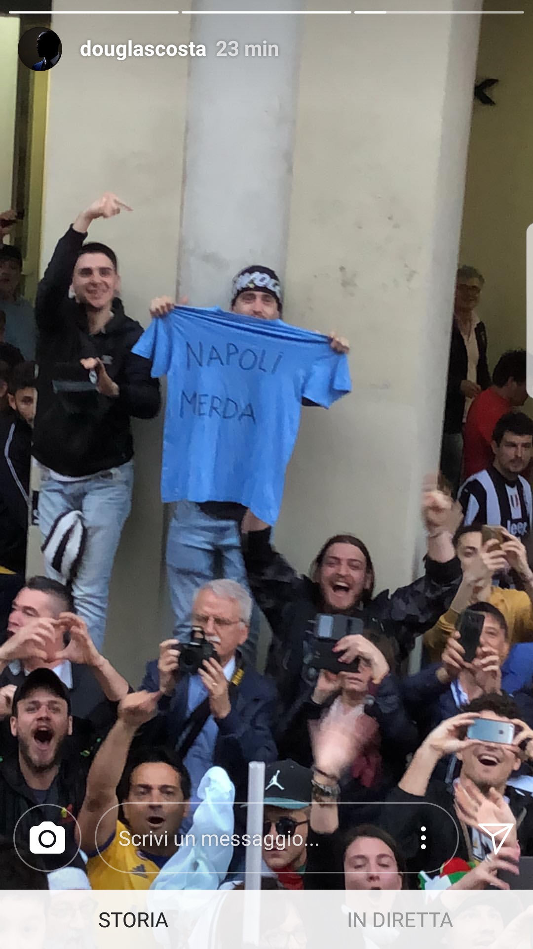 Dopo le invettive di Chiellini e le provocazioni di Benatia e Matuidi, da Torino giunge un'altra lezione di stile, stavolta targata Douglas Costa: il brasiliano, che già una settimana fa aveva fatto riferimento alle parole di Insigne con un post su Instagram (clicca qui), stavolta ha deciso di dedicare una 'storia' su Instagrama a un tifoso che impugnava una maglia azzurra con un pesante insulto a Napoli. L'immagine vale più di ogni commento.