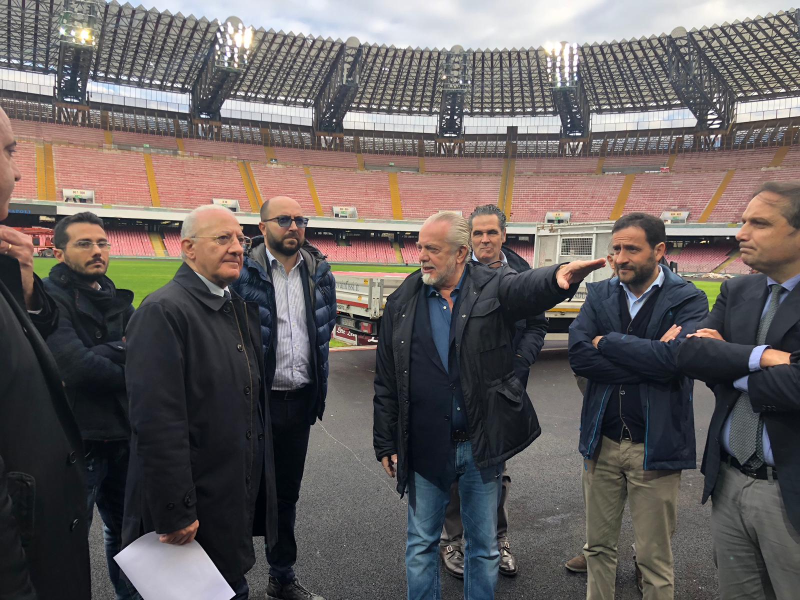 Sopralluogo allo stadio San Paolo per fare il punto sui suoi lavori, con la recente installazione del nuovo impianto d'illuminazione. Presenti tra gli altri Aurelio De Laurentiis, il governatore Vincenzo De Luca e l'assessore allo sport del comune di Napoli Ciro Borriello, che ha dichiarato: "Il sopralluogo stadio San Paolo, al lavoro per verificare lo stato dei lavori, luci, bagni, spogliatoi e impianti. Uno stadio che alla fine dei lavori sarà all’altezza di una grande città e di una grande squadra".