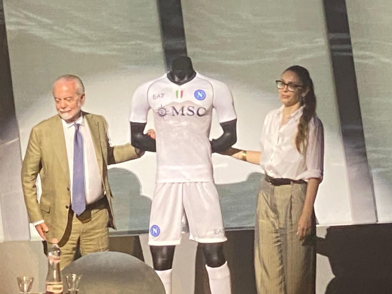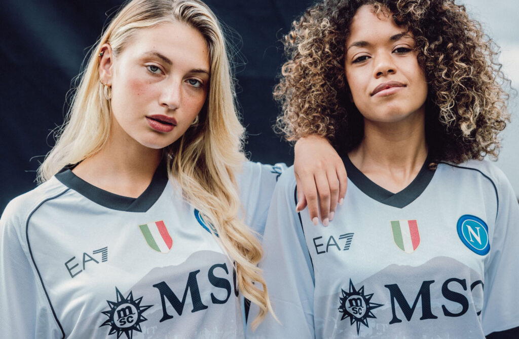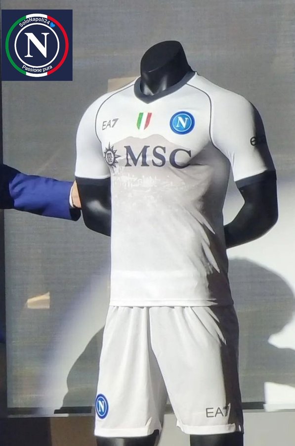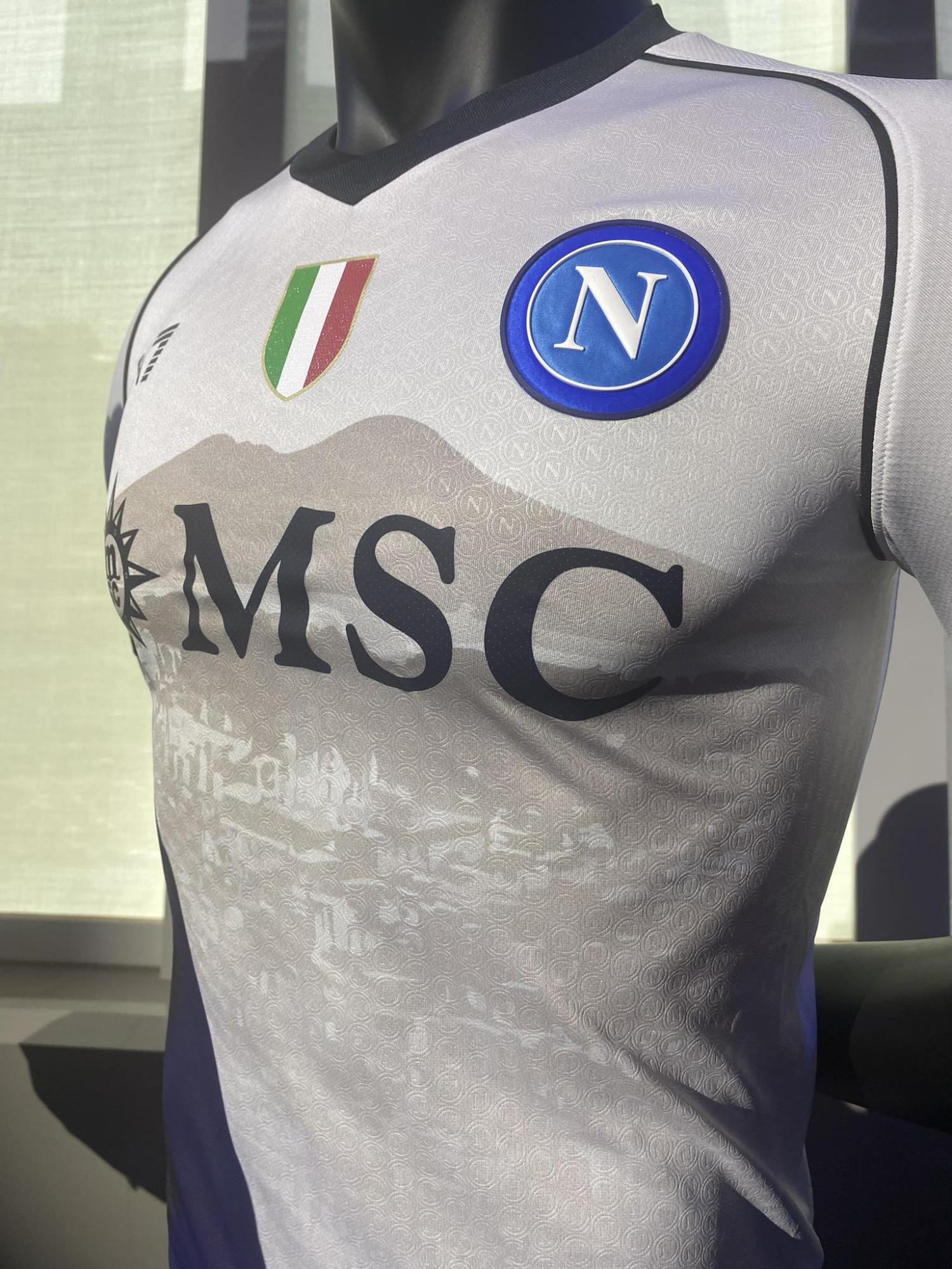 La SSC Napoli, in collaborazione con EA7, presenta i nuovi kit Home and Away per la stagione sportiva 2023/2024. La Maglia Away presenta una stampa in digitale e stilizzata del Vesuvio di Napoli, simbolo dell’identità della città. Nuovo styling di manica raglan su tessuto tecnico stretch con piping in contrasto blu, collo a V ad incrocio e linea fondo della manica in blu. Nuovo motivo allover “N” con tecnica di stampa a caldo su materiale tecnico traspirante con tecnologia Dry Touch. Patch classico Napoli in silicone e scudetto tricolore personalizzato.