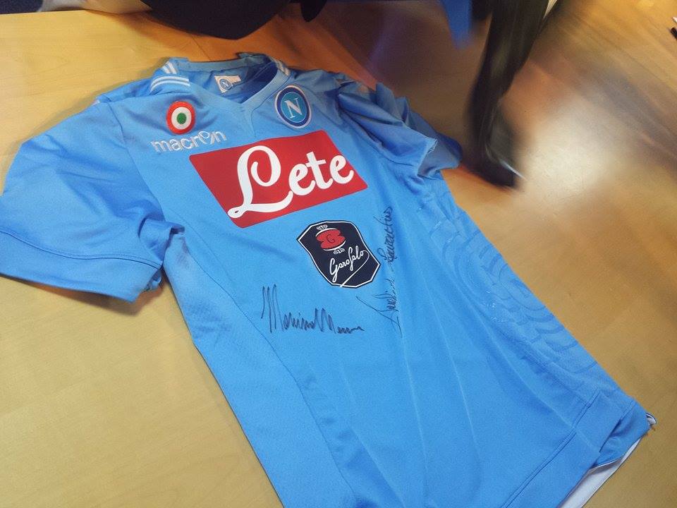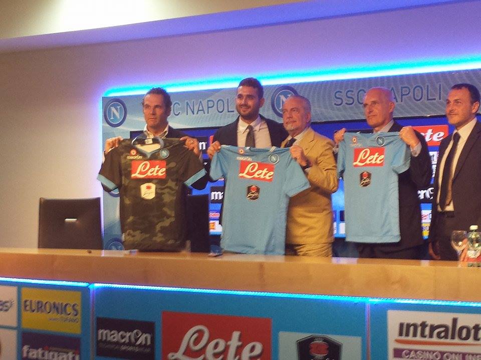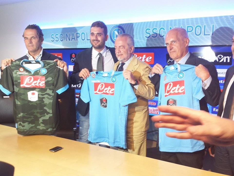 Terminata la conferenza stampa (clicca qui per il live integrale) è stata mostrata la maglia del Napoli dell'ultima stagione con il nuovo sponsor e la coccarda della Coppa Italia. Di seguito alcuni scatti di Tutto Napoli