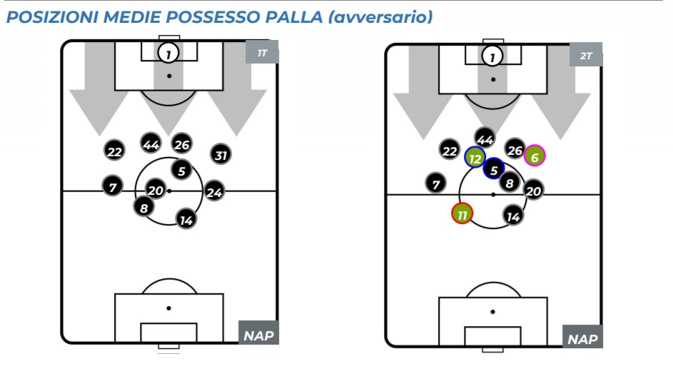 Dai grafici delle posizioni medie della Lega, che si basano sul rilevamento satellitare per ogni giocatore, si può vedere chiaramente che non è cambiato il solito atteggiamento che Ancelotti porta avanti da un anno. 4-4-2 in fase difensiva sia nel primo che nel secondo tempo e Zielinski, pur avendo caratteristiche diverse, ha occupato alla fine la stessa zona di Insigne, uscito all'intervallo. Anzi, con l'ingresso di Lozano, qualche metro più avanti rispetto a Fabian nel primo tempo, si può dire che il Napoli è stato addirittura più sbilanciato nella ripresa.
