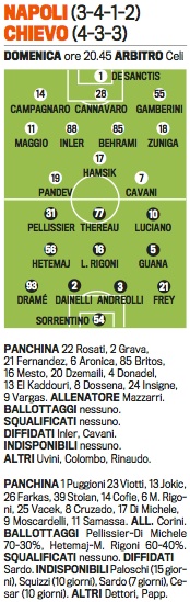 E' già tempo di pensare a Napoli-Chievo. Bisogna smaltire l'amarezza per la seconda sconfitta consecutiva in Europa League e gettarsi a capofitto sul campionato. La formazione sembra praticamente fatta, anche se le noie muscolari di Behrami, che hanno costretto Mazzarri a schierare Zuniga ieri sera, andranno valutate nelle prossime ore. Ecco di seguito il grafico della Gazzetta dello Sport: