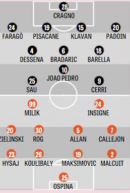 Sono cinque i cambi rispetto alla formazione schierata ad Anfield da parte di Carlo Ancelotti stando alle probabili formazioni di Cagliari-Napoli pubblicate questa mattina dalla Gazzetta. Confermato tra i pali Ospina. In difesa Maksimovic viene spostato al centro al fianco di Koulibaly, sulle fasce ci saranno Hysaj e Malcuit. In mediana Rog prende il posto di Hamsik accanto ad Allan, Callejon e Zielinski saranno gli esterni. In avanti confermato Insigne, ci sarà Milik al suo fianco.