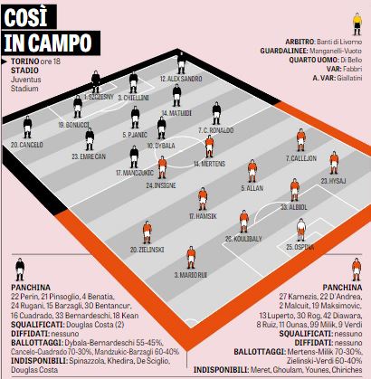 Solo due dubbi per Carlo Ancelotti in vista della gara di oggi alle 18 contro la Juventus secondo le probabili formazioni della Gazzetta dello Sport oggi in edicola. Il primo in attacco con il ballottaggio tra Mertens e Milik con il belga favorito (70% di possibilità per lui secondo la rosea) per fare coppia con Insigne. L'altro dubbio sugli esterni: a destra Callejon, a sinistra uno tra Zielinski e Verdi con il polacco che ha qualche chance in più (60% secondo la rosea). Per il resto secondo la Gazzetta la formazione è fatta. In mediana ci saranno Hamsik ed Allan. Tra i pali ritorna Ospina e la difesa a quattro sarà composta da Hysaj, Albiol, Koulibaly e Mario Rui.