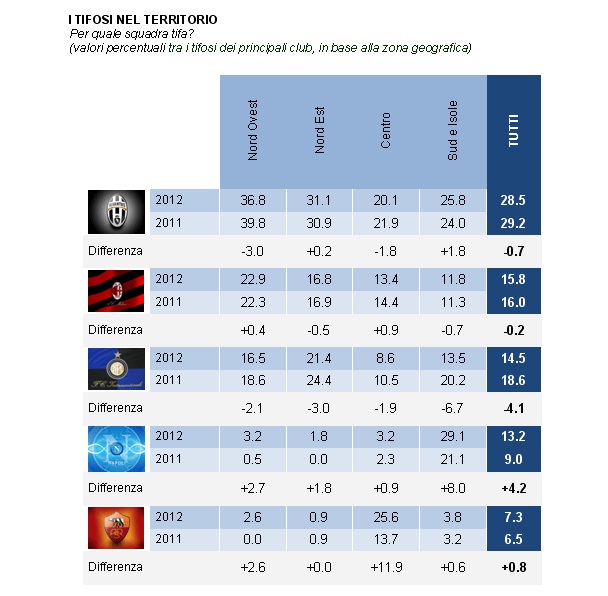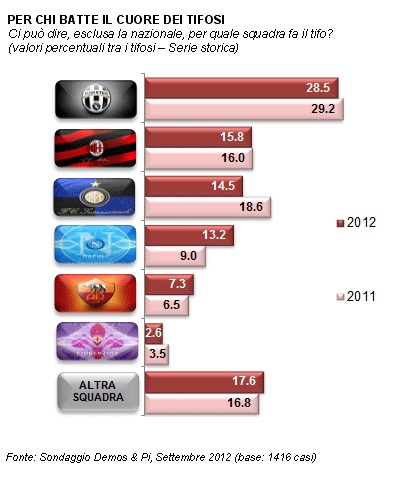 Sono dati molto interessati quelli emersi dallo studio "Il tifo calcistico in Italia", l'Osservatorio sul Capitale Sociale realizzato da Demos & Pi in collaborazione con Coop (Ass. Naz.le cooperative di consumatori) e con la partecipazione di "La Polis - Università di Urbino" per la parte metodologica e di "Medialab - Vicenza" per quella organizzativa. Dai dati del sondaggio, condotto da Demetra nel periodo 03 - 07 settembre 2012, emerge che il Napoli è la quarta squadra italiana per numero di tifosi, con il 13,2 %, non lontanissima dall'Inter terza (14,5 %) e dal Milan seconda (15,8 %). Sempre prima la Juventus con un 28,5 % di preferenze. L'aspetto più interessante, però, è che il gradimento per il Napoli, rispetto ad un anno fa, è cresciuto dal 9 % al 13,2 %, segno che le splendide prestazioni in Champions League della stagione passata, hanno evidentemente contribuito a far affezionare nuovi appassionati ai colori azzurri. Questo nuovo dato ha permesso anche il sorpasso della società partenopea ai danni della Juve come squadra più amata nel Sud Italia, con l'attuale 29,1 % delle preferenze contro il 25,8 % dei bianconeri, che nel 2011 guidavano con il 24 % a fronte del 21,1 % di gradimento riscosso dal club di De Laurentiis. Non ci sono, invece, grosse sorprese per quanto riguarda il "tifo contro": per l'80 % dei supporters azzurri interpellati, infatti, la squadra più "antipatica" è la Juventus, seguita ad enorme distanza dal Milan. Vi è poi, all'interno dell'ampio studio, anche un dato legato alle "simpatie politiche". I tifosi del Napoli intervistati, secondo lo studio di Demos, sono più orientati verso schieramenti di sinistra, a differenza di quelli di Juventus, Inter e Milan che prediligono la "parte opposta".