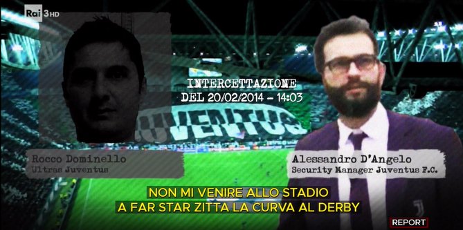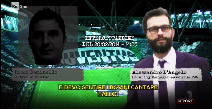 Poi le intercettazioni che Report manda in onda tra Rocco Dominello e D'Angelo, con quest'ultimo che fa chiaro riferimento ai tifosi del Torino: "Non mi venire allo stadio a far stare zitta la curva al derby, e devo sentire i bovini cantare!". Nelle intercettazioni inedite che Report manda in onda, D’Angelo tratta, attraverso Bucci, con tutti i gruppi dei tifosi juventini perché non vuole che il giorno del derby ci sia lo sciopero del tifo e il silenzio (i bovini sarebbero i tifosi del Toro).".