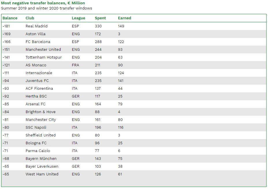 IL SALDO DELLE ALTRE - In Italia la squadra che ha il rapporto economico acquisti/cessioni più negativo è l'Inter (-111), seguita a ruota dalla Juventus (-94) e dalla Fiorentina (-93). In Europa nessuno spende più e incassa meno del Real Madrid (-181). In classifica presenti anche Bologna (-71) e Parma (-71).