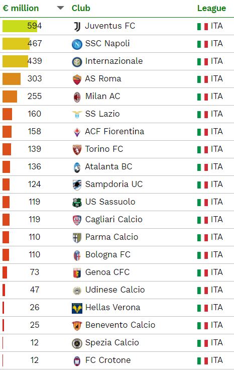 Uno studio condotto dal CIES ha evidenziato quali sono le società che hanno speso di più nel corso delle varie finestre trasferimenti per allestire le rispettive squadre. La classifica fa fede al 2019 e somma i costi per l'acquisto di ogni giocatore della rosa. Il Manchester City è l'unica a sfondare il tetto del miliardo di euro mentre la Juventus è l'unica a entrare nella Top 10. A ljvello europeo è il Napoli è al tredicesimo posto.