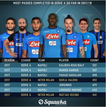 C'è un dato, più di ogni altro, che dimostra come il gioco del Napoli sia una spanna sopra rispetto a tutte le altre in Serie A. Se si va a vedere la classifica dei passaggi completati fin qui in campionato, si può notare come nelle prime sei posizioni ci siano addirittura cinque azzurri. In ordine: Koulibaly, re indiscusso con 531 passaggi completati, Hamsik (507), Ghoulam (498), Jorginho (479), Insigne (442). Tra Ghoulam e Jorginho, al quarto posto, si inserisce Borja Valero con 492 passaggi. Ecco la tabella: