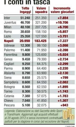 Con l'aumento dell'ingaggio di Cavani, il Napoli sfora il suo tetto e si piazza al sesto posto della speciale classifica. Ecco di seguito l'analisi proposta dal Corriere del Mezzogiorno: Il Matador diventa, così, il calciatore che, con l’incremento al suo stipendio, fa sfondare il tetto dei venti milioni netti di monte ingaggi annuali al Napoli. Il nuovo «salary cap» non si distanzia molto da quello dello scorso anno, ma si deve comunque considerare che la cifra totale è di fatto lievitata perchè all’appello mancano due contratti «forti» come quelli di Lavezzi (passato al Psg) e Gargano (trasferitosi all’Inter). Inoltre, in una congiuntura negativa nella quale le squadre di serie A stanno tagliando o spalmando su più anni gli stipendi dei calciatori — basti pensare che il Milan ha risparmiato, come rivelò lo stesso Berlusconi, «circa 150 milioni di euro sui contratti di Ibrahimovic e Thiago Silva» — mantenere un bilancio così importante è comunque un segnale di consistenza finanziaria della società. Proprio i rossoneri, secondo i primi calcoli sul monte ingaggi, avrebbero ridotto di quasi il 23% il tetto degli emolumenti. Stesso lavoro ha predisposto l’Inter, per un risparmio calcolato di quasi 28,6 milioni di euro, e dalla maggioranza delle compagini italiane ad eccezione della Roma che ha aumentato il numero dei giocatori in rosa e ha incrementato anche l’ingaggio di De Rossi. Questa operazione di sistema avvicina gran parte dei club di serie A alla prospettiva del fair play finanziario ma, economicamente, allontana l’italcalcio dalle big degli altri campionati europei. Basta guardare la classifica stilata da «Sportintelligence» qualche mese fa per verificare quanta distanza ci sia, oramai, con il Barcellona (217 milioni lordi di stipendi), Real Madrid (194 milioni lordi di ingaggi) o Manchester United (185 milioni). Ma anche con Bayern Monaco (170 milioni) o Chelsea (169 milioni).