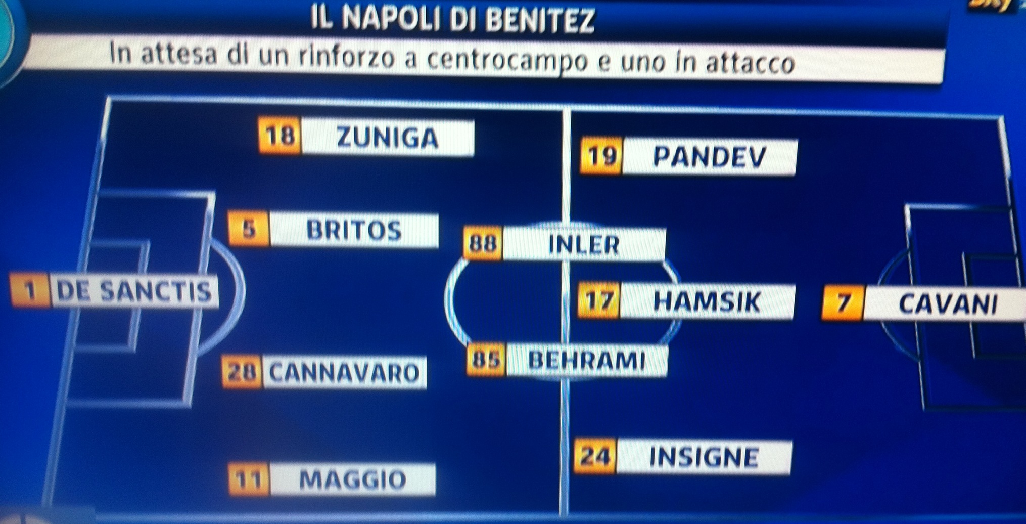 Con l'imminente approdo di Rafa Benitez sulla panchina del Napoli sono già partite le fantasie della tifoseria sulle garanzie richieste alla società dallo spagnolo, sui nomi indicati al club prima di firmare l'accordo biennale o, addirittura, sull'eventuale richiesta di non cedere Edinson Cavani. In realtà, pur essendo la squadra abituata da anni ad un modulo diverso, il materiale umano a disposizione sembra sposarsi piuttosto bene col 4-2-3-1 che solitamente schiera lo spagnolo. Nella linea a quattro si sprecano i centrali difensivi (oltre a Cannvaro e Britos ci sono Gamberini, il rientrante Fernandez ed eventualmente Rolando, mentre sui lati Maggio e Zuniga rappresentano una garanzia). A centrocampo l'attuale tecnico del Chelsea, così come Mazzarri, schiera una coppia di mediani anche se, con ogni probabilità, chiederà almeno un giocatore con maggiore qualità in fase di impostazione. In attacco, considerando per ora la permanenza di Cavani, alle sue spalle ci sarebbe un terzetto di grande qualità con Hamsik rifinitore centrale ed Insigne e Pandev sugli esterni. Probabile, però, che alle caratteristiche del macedone siano preferite quelle di un giocatore più veloce e abile nell'uno contro uno - e che al momento manca in rosa - con Pandev tenuto come alternativa ad un ruolo più centrale. Una bozza, niente di più, del Napoli attuale, che sicuramente subirà grosse modifiche. In un'estate che si preannuncia caldissima...