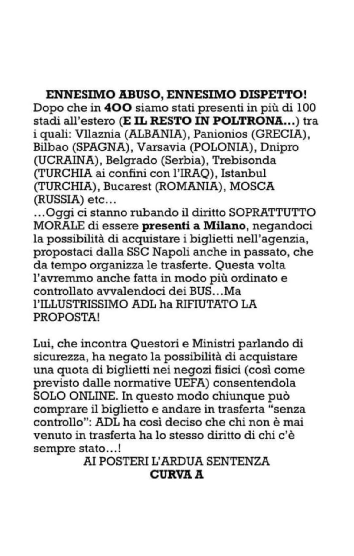 A partire dalla 18 è possibile acquistare i biglietti del settore ospiti per l’andata dei quarti di finale della Champions League tra Milan e Napoli. Per le prime 48 ore, e precisamente fino alle ore 18.00 di sabato 8 aprile 2023, la vendita è riservata agli abbonati della stagione 2022-23. A partire dalle ore 19.00 di sabato 8 aprile 2023, nel caso in cui vi siano ancora biglietti disponibili, proseguirà la vendita libera fino alle ore 23.59 di domenica 9 aprile. La Curva A ha emesso un comunicato che vi proponiamo di seguito in cui gli ultras criticano la De Laurentiis in merito alla modalità di vendita dei biglietti.