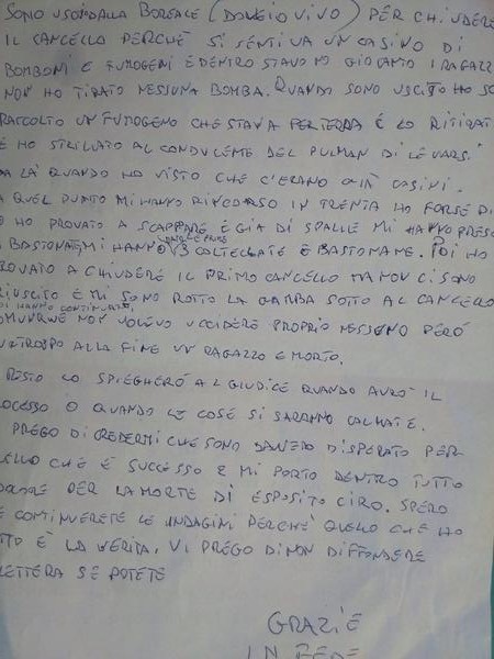 A quel punto mi hanno rincorso in trenta o forse di pù, ho provato a scappare ma già di spalle mi avevano preso a bastonate. Mi hanno dato tre coltellate ed altre bastonate. Poi ho provato a chiudere il primo cancello ma non ci sono riuscito e mi sono rotto la gamba sotto al cancello. Non volevo uccidere proprio nessuno però purtroppo alla fine un ragazzo è morto. Il resto lo spiegherò al giudice quando avrò il processo o quando le cose si saranno calmate. Sono davvero disperato per quello che è successo e mi porto dentro tutto il dolore per la morte di Esposito Ciro. Spero che continuerete le indagini perchè quello che ho detto è la verità. Vi prego di non diffondere la lettera se potete".