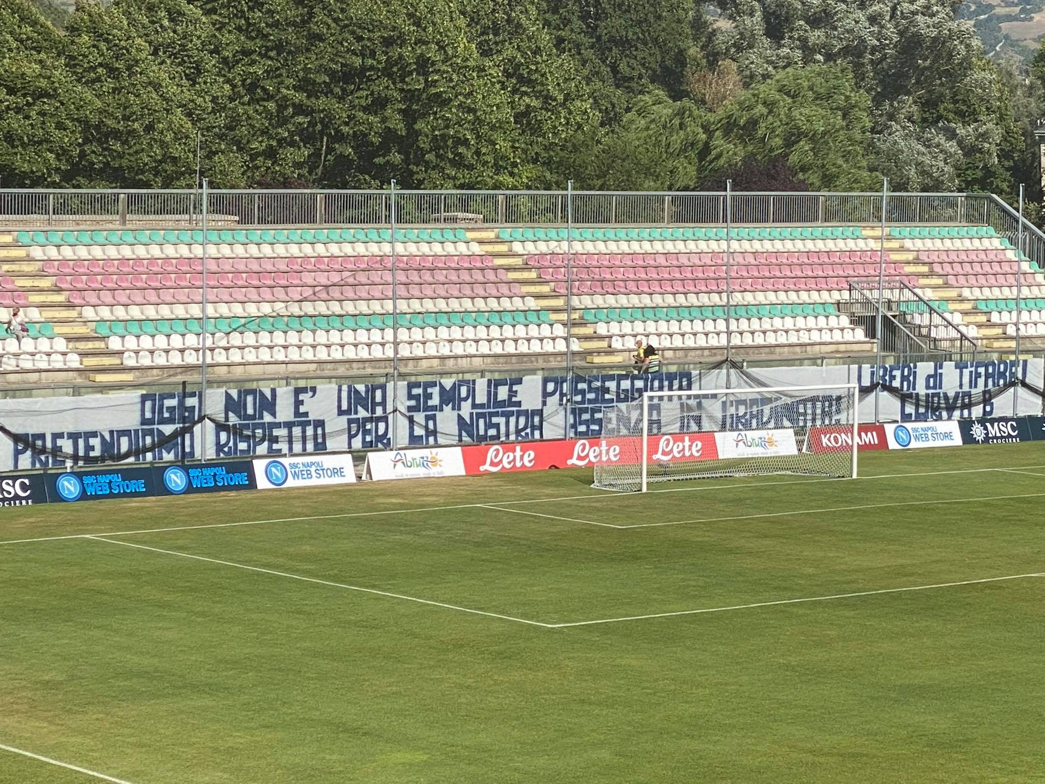 All'interno dello stadio Patini, dove tra meno di un'ora andrà in scena la quinta amichevole del pre-campionato del Napoli contro l'Ascoli, la Curva B ha esposto uno striscione. "Oggi non è una semplice passeggiata, pretendiamo rispetto per la nostra assenza in gradinata. Liberi di tifare, Curva B", scrive il tifo organizzato azzurro. Di seguito lo scatto a cura del nostro inviato.