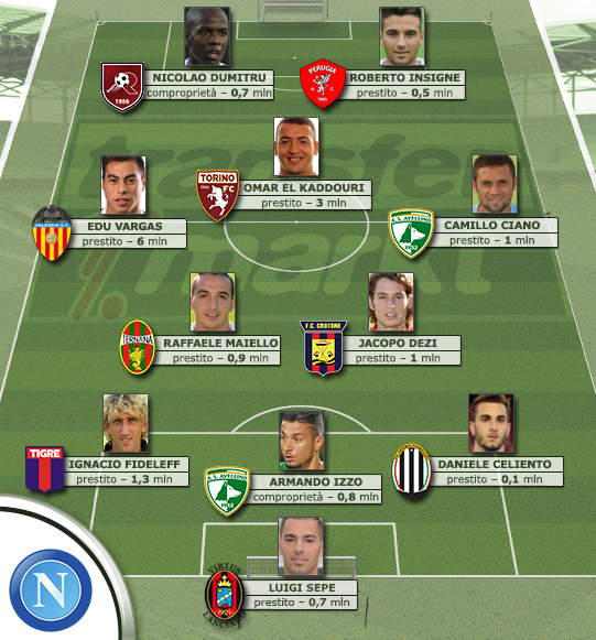 CENTROCAMPO - Per la zona centrale del campo sugli scudi tre giocatori in prestito con diritto di riscatto della metà: un ottimo Jacopo Dezi (22) al Crotone, Raffaele Maiello (23) alla Ternana e Camillo Ciano (24) all'Avellino. Sulla corsia sinistra di questo ipotetico 3-4-1-2 potrebbe agire Edu Vargas (24) che non sta demeritando al Valencia mentre sulla trequarti spazio ad Omar El Kaddouri (23) ora protagonista col Torino.