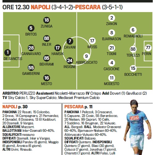 Le probabili formazioni di Napoli-Pescara: Mazzarri si affida di nuovo al terzetto difensivo Gamberini-Cannavaro-Britos, che ha fatto molto bene nella trasferta di Cagliari. A centrocampo Mesto sostituisce l'infortunato Maggio. In avanti Hamsik agirà alle spalle del tandem Insigne-Cavani. Il Pescara si presenta al San Paolo con tante defezioni: manca Quintero, al suo posto lo slovacco Weiss. Ecco il grafico tratto dalla Gazzetta dello Sport