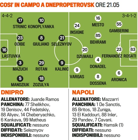 Il Napoli sarà in campo questa sera alla Dnipro Arena per rimanere ancora incollato all'Europa League: una sconfitta pregiudicherebbe il cammino europeo, mentre un pareggio terrebbe ancora in corsa gli azzurri che poi dovrebbero cercare di vincere le tre gare rimanenti. Mazzarri è orientato a schierare una formazione equilibrata, con le cosiddette seconde linee che scenderanno in campo consapevoli di avere un compito non agevole. Il tecnico schiera rinforza il centrocampo con Behrami che affiancherà Inler, mentre Dzemaili avrà il compito di lanciare Insigne e Vargas in attacco: da loro due il tecnico si aspetta una risposta importante soprattutto dal punto di vista realizzativo. Vargas è fermo ai tre gol segnati al modesto Aik Solna, mentre Insigne è ancora all'asciutti. Stasera tocca a loro trascinare il Napoli. Ecco di seguito il grafico con le formazioni ipotizzate dalla Gazzetta dello Sport: