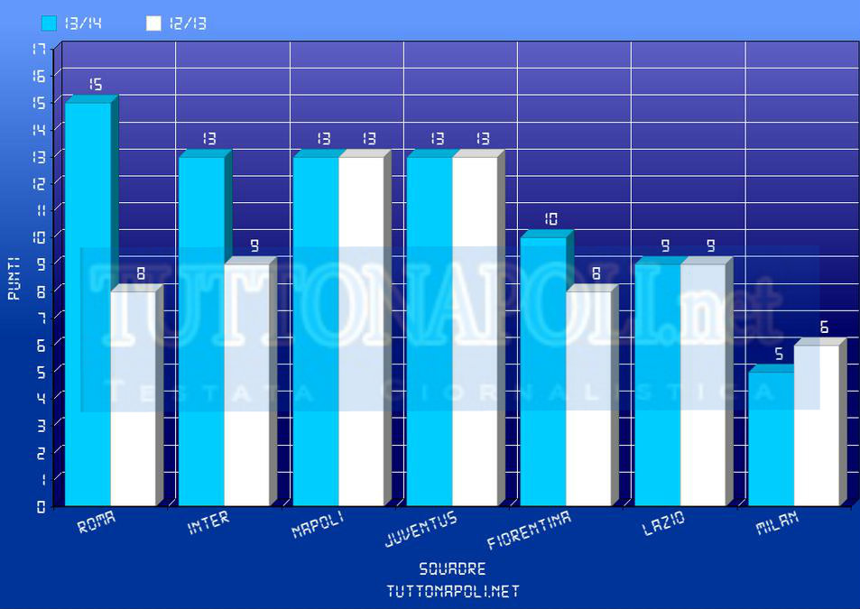 Archiviate le prime cinque giornate di campionato, è tempo di un piccolo bilancio riguardante le redivive Sette Sorelle. Rispetto allo scorso anno, emergono due dati: la crescita incredibile della Roma e la costanza di Napoli e Juventus. La squadra di Rudi Garcia fa segnare un ottimo +7 rispetto al campionato passato, un avvio inaspettato e di grande impatto. Bianconeri ed azzurri, invece, si trovano in questo momento con gli stessi punti del 2012/13: se per i campioni d'Italia c'è poco da sorprendersi, fa effetto vedere quanto i partenopei non abbiano affatto accusato il cambio radicale della guida tecnica. Bilancio positivo per Inter e Fiorentina (rispettivamente a +4 e +2), mentre la Lazio resta in pari (9 punti in entrambi i campionati). L'unica grande a far registrare un clamoroso calo è il Milan: la squadra di Allegri è riuscita a peggiorare il tragico inizio dell'anno scorso avendo messo in cascina solo 5 punti.