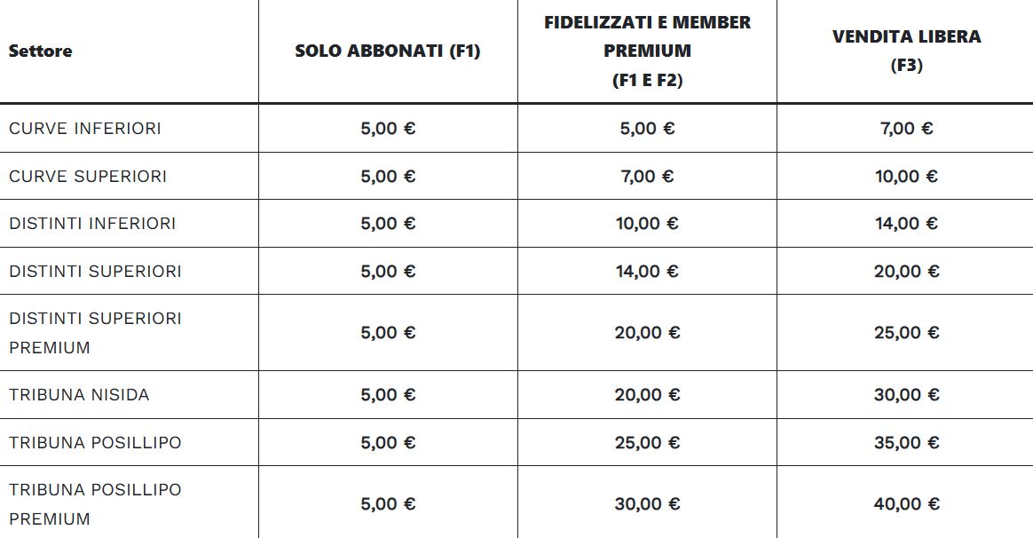 La vendita dei biglietti si articola in tre fasi. La prima fase (Fase 1) di vendita sarà riservata ai titolari di un Abbonamento SSCN 25/26, sia ITALIA che FULL e ai possessori di Fidelity Card “Fan Stadium Card”. Prima dell’apertura della fase di vendita libera (Fase 3), inoltre, i possessori della Membership Premium SSC Napoli powered by KDA3 potranno accedere ad una seconda fase di vendita prioritaria ad essi dedicata (Fase 2), per la quale il Club riserverà una specifica quota di biglietti.
