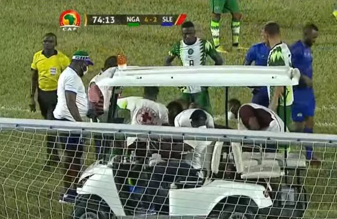 Osimhen down, he has been been taken off the pitch as he appears to have hurt his wrist. NGA 4-2 SLE #SoarSuperEagles #Team9jaStrong