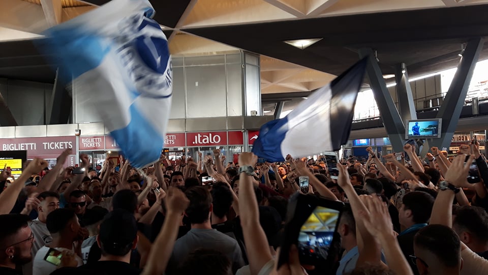 15.20 - Presenti anche gli ultras, con i loro bandieroni, nel piazzale antistante la stazione. Ovviamente, tanti cori per gli azzurri che sono partiti da Castel Volturno e a breve faranno il loro arrivo in stazione.
