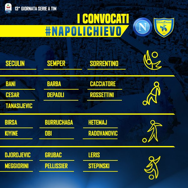 Il Chievo Verona ha reso noti i convocati per la sfida di Napoli di domani: tornano a disposizione Filip Djordjevic e Fabrizio Cacciatore. Non ci sarà, invece, l'ex azzurro Giaccherini.