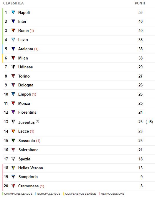 Brutta battuta d'arresto per l'Atalanta in zona Champions League. Gli orobici perdono 1-0 sul campo del Sassuolo e restano dunque a 38 punti, -2 dal secondo posto in attesa dell'Inter e del Milan che si sfideranno domani. Bel balzo del Sassuolo invece in zona salvezza, con i neroverdi che si portano a 23 punti con un momentaneo +10 sul terzultimo posto. Di seguito la classifica aggiornata: