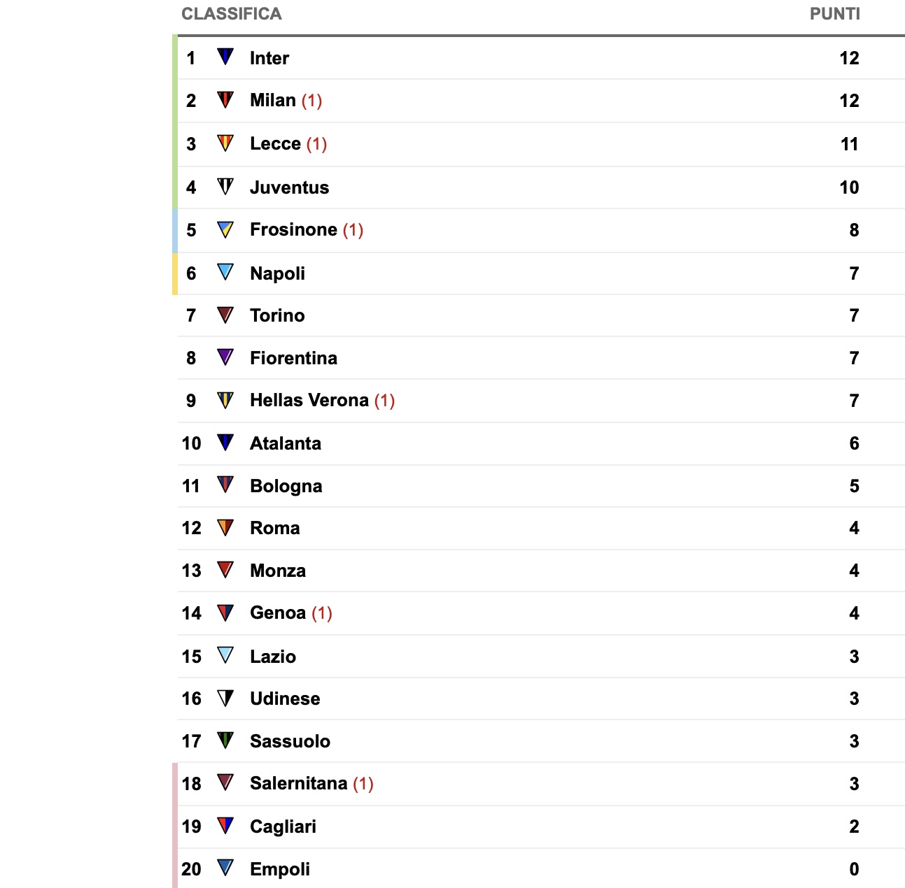 CLASSIFICA - Il Milan aggancia l'Inter in vetta: momentaneo +5 sul Napoli