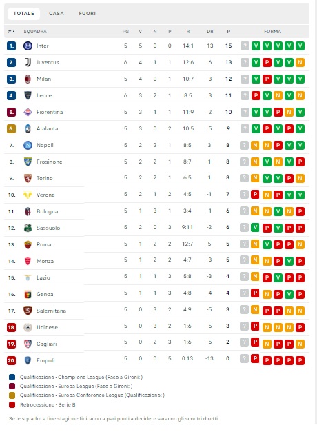 Serviva una vittoria per la Juventus. E vittoria è stata. Dopo la figuraccia di sabato sera sul campo del Sassuolo, i bianconeri ritrovano il successo superando un Lecce che solo oggi, alla sesta giornata, incassa la prima sconfitta in questa Serie A. A decidere la gara è Milik al 57'. Con questi tre punti, Allegri sale momentaneamente al secondo posto in classifica, in attesa del 6° turno in campo tra domani e giovedì. Il Lecce, come detto, si ferma a 11 punti. Ecco la classifica aggiornata dopo l'anticipo della 6^ giornata di Serie A: