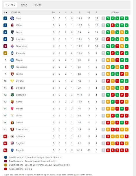 Con Torino-Roma si è chiusa la quinta giornata della Serie A. 1-1 il risultato allo Stadio Olimpico Grande Torino, con i granata che riagganciano il Napoli a quota 8 punti. Non decolla, invece, il campionato della Roma, che resta a 5 punti assieme al Monza, uno in più della Lazio. Di seguito la classifica aggiornata.