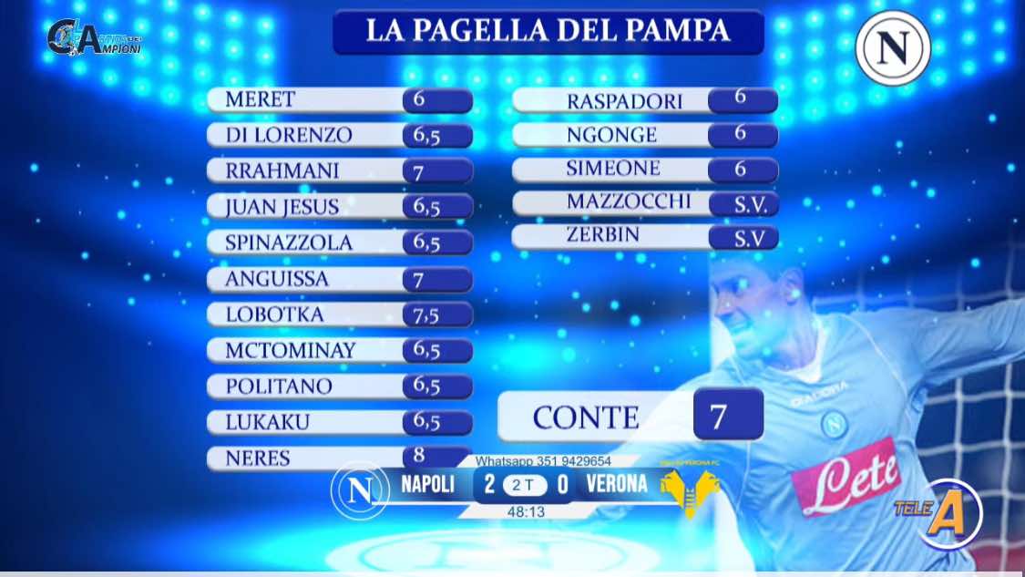 Ai microfoni di Tele A l'ex azzurro Roberto Sosa, ha s tilato le pagelle agli azzurri per la vittoria contro il Verona. Migliore in campo per il Pampa è David Neres, che prende un otto pieno. Alle spalle del brasiliano Lobotka, 7,5 per lo slovacco. Seguono un sontuoso Rrahmani e Anguissa, autore del secondo gol azzurro. 7 anche al tecnico del Napoli Antonio Conte.