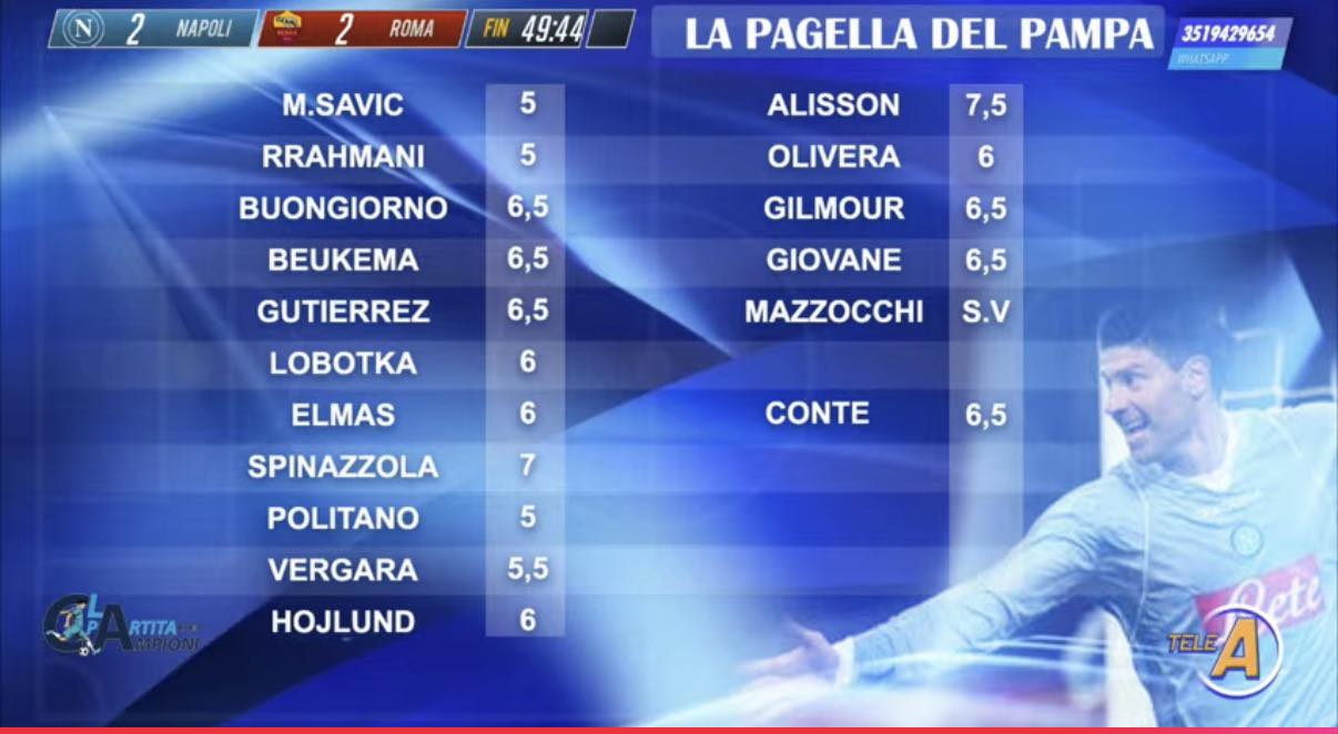 Roberto 'El Pampa' Sosa, ex attaccante azzurro, ai microfoni di Tele A nel corso de 'La Partita dei Campioni' ha dato le sue pagelle per Napoli-Roma 2-2. Il migliore in campo è l'ultima arrivato in maglia azzurra, che col suo gol evita al Napoli il primo ko casalingo della stagione, 7,5 per Alisson Santon.