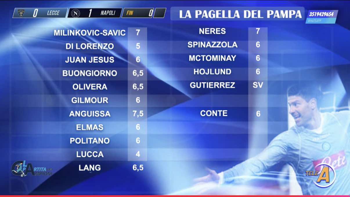 Migliore in campo ancora una volta Frank Zambo Anguissa: 7,5 per lìautore del gol decisivo. Altro uomo chiave del match Milinkovic-Savic, che ad inizio ripresa para un rigore a Camarda e permette agli azzurri di restare in partita, 7 in pagella per il serbo. 7 anche per Neres che entra bene al posto di Lang, molto pericoloso per i salentini soprattutto quando passa sulla fascia destra al posto di Politano. Di seguito tutti i voti di Sosa.