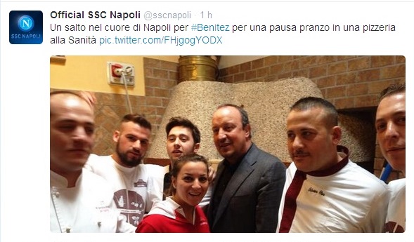 A Radio Crc nella trasmissione “Si gonfia la rete” è intervenuto Ciro Oliva, proprietario di Concettina, pizzeria di Napoli: "Verso le 12.30 di ieri al mio ristorante, Concettina ai 3 santi, è arrivato Rafa Benitez che ha mangiato una pizza con l’autista e un amico. Gli abbiamo dedicato e portato al tavolo una pizza margherita con il cornicione ripieno. Poi, Benitez desiderava assaggiare il “cuoppo” composto da crocchè, arancini, e fritti vari. L’allenatore venendo nella Sanità, ha dato un grande supporto al quartiere.