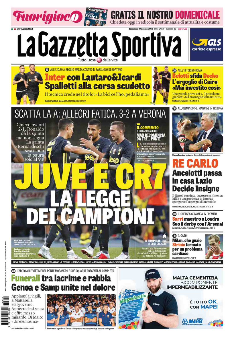 "Juve e CR7, la legge dei campioni", titola la Gazzetta dello Sport celebrando la vittoria sofferta dei bianconeri contro il Chievo. Il successo del Napoli sul campo della Lazio viene relegato di spalla: "Re Carlo. Ancelotti passa in casa Lazio, decide Insigne". In taglio alto l'Inter con Lautaro e Icardi e Spalletti alla corsa Scudetto.