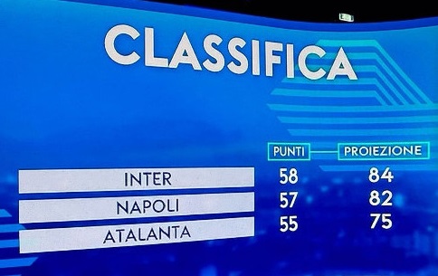 L’Inter giocherà una partita contro le prime quattro, tre partite contro squadre del gruppo delle coppe, che abbiamo identificato dalla quinta fino alla Roma, tre contro il gruppo tranquillo e quattro contro il gruppo salvezza. Il Napoli ha sei partite col il gruppo salvezza e le ultime sette partite sono molto favorevoli. Una gara col gruppo scudetto, sei gare con il gruppo coppe, una gara tranquillità e tre gare salvezza invece per l’Atalanta. In base alla divisione punti e al calendario la classifica verrebbe fuori così: Inter 84 punti, Napoli 82, Atalanta 75. Però c’è un delta di punti almeno per squadra, quindi in teoria potrebbe anche essere ribaltata la situazione: Napoli 84, Inter 82, perché il delta è di due punti in più o in meno. Questo vuol dire che non è tanto lontana una clamorosa ipotesi di spareggio, cioè si potrebbe arrivare anche a pari punti. Inoltre l’Inter dovrebbe mantenere un certo vantaggio giocando bene e vincendo le prossime partite, perché poi il Napoli avrebbe un calendario più favorevole”.