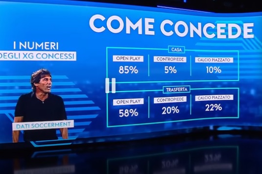 L’altezza degli interventi difensivi precipita, perché difendere 8 metri indietro è tantissimo. La distanza dei tiri concessi in trasferta si riduce ed arriva a 15 metri. L’Xg per tiro raddoppia, addirittura da 0,06 a 0,11. Quindi il Napoli concede tantissimo fuori casa. Per quanto riguarda i numeri degli Xg, le occasioni concesse, in casa in open play ne concede l’85%, in contropiede il 5%, su calcio piazzato il 10%. In trasferta paradossalmente in contropiede concede il 20%, su calcio piazzato addirittura il 22% e in open play il 58%.