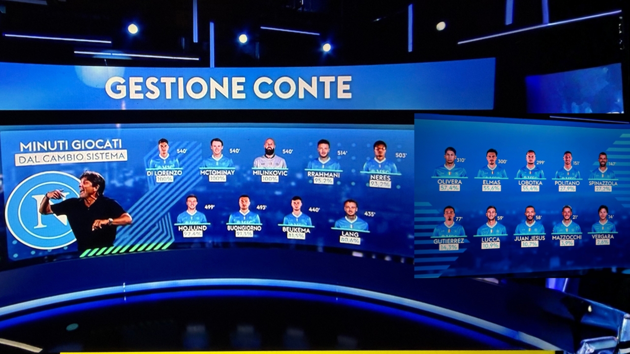 Per quanto riguarda i minuti giocati. Sono stati il 100% per Milinkovic-Savic, Di Lorenzo, McTominay, quasi il 100% per Rrahamni, Neres, Buongiorno, Beukema, Lang. Cioè andiamo dal 100% all'80% dei minuti, tantissimo! Il decimo, che è Olivera, ed Elmas, sono al 57%, Lobotka che si era fatto male al 55%. Poi precipitiamo: Spinazzola, che non era stato tanto bene, 27%, Politano anche 27%, Mazzocchi 3%, Vergara addirittura 2,6%. E ovvio, vedendo quelli che mancano, che è in grande difficoltà. Ma Conte poteva fare ancora qualche cambio o il livello è tanto diverso? Penso ad esempio Politano. A metà campo gli mancano praticamente tutti".
