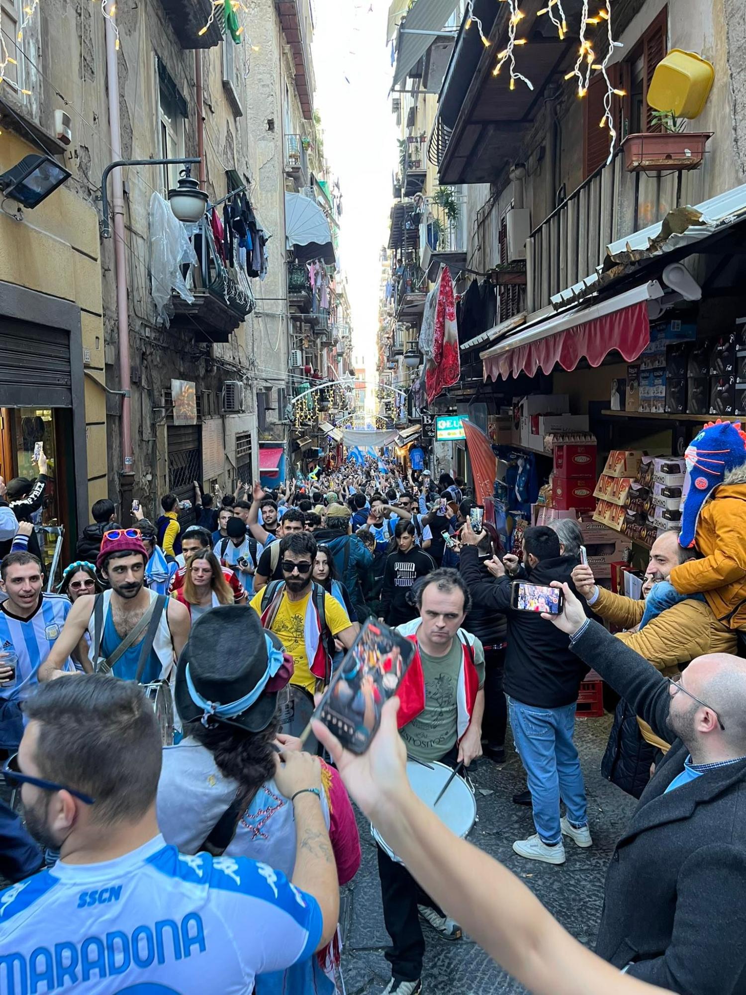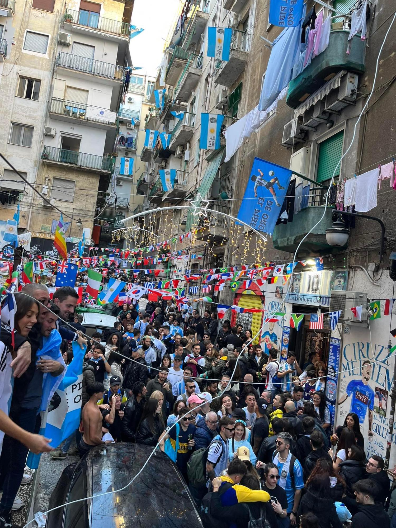 Il corteo argentino che ha invaso Napoli è arrivato al Murales Maradona ai Quartieri Spagnoli. Continua la spasmodica attesa dei tifosi argentini per la finale dei Mondiali in Qatar contro la Francia. Il lungo corteo dei tifosi dell'Albiceleste, come in un vero e proprio pellegrinaggio, è giunto nel luogo ormai diventato di culto di Diego Armando Maradona. Di seguito le immagini dal nostro inviato.